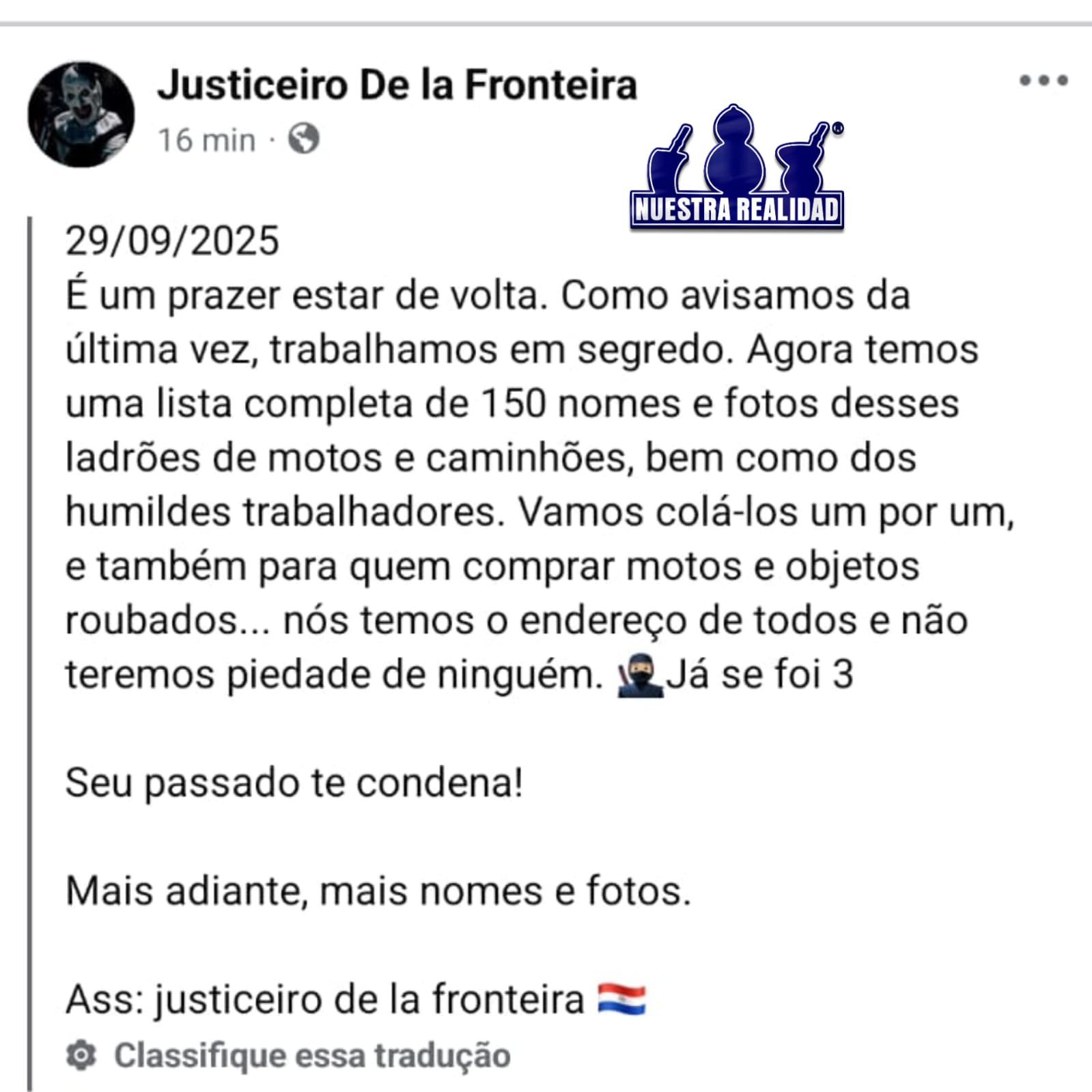 PEDRO JUAN CABALLERO / PONTA PORÃ: A través de una cuenta de X, los autodenominados “Justicieros de la Frontera”, lanzaron unas amenazas de muerte a quienes ellos consideran, ladrones de motocicletas y camiones, como así también quienes comprar estos motos y objetos robados.