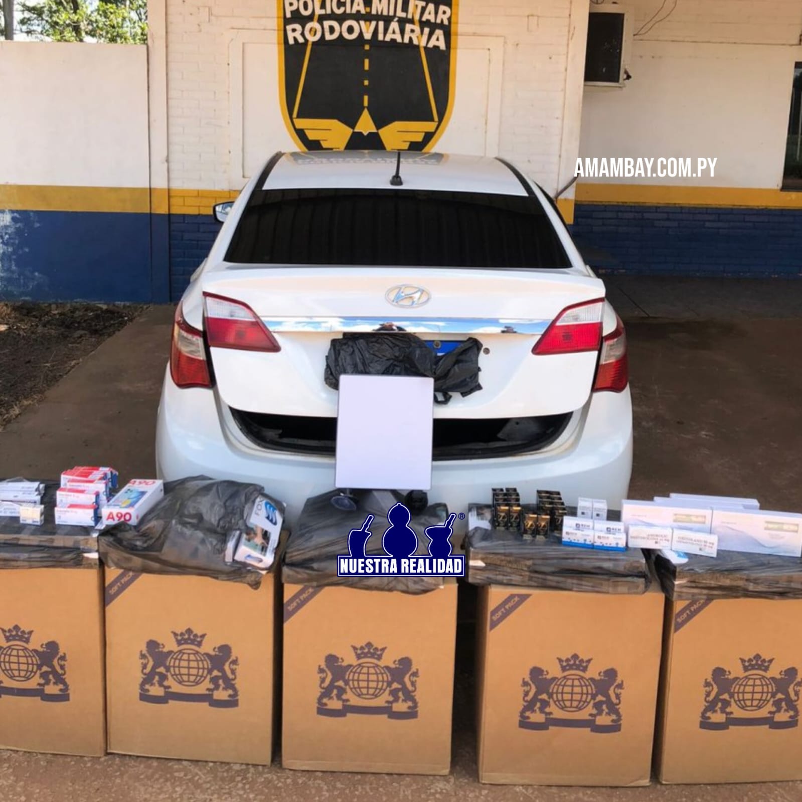 Na vistoria inicial, foram localizadas 06 caixas de cigarros da marca FOX, totalizando 300 pacotes de origem estrangeira. Durante busca minuciosa no veículo, foram encontrados diversos medicamentos importados ocultos na lataria do porta-malas e sob o carpete dianteiro.