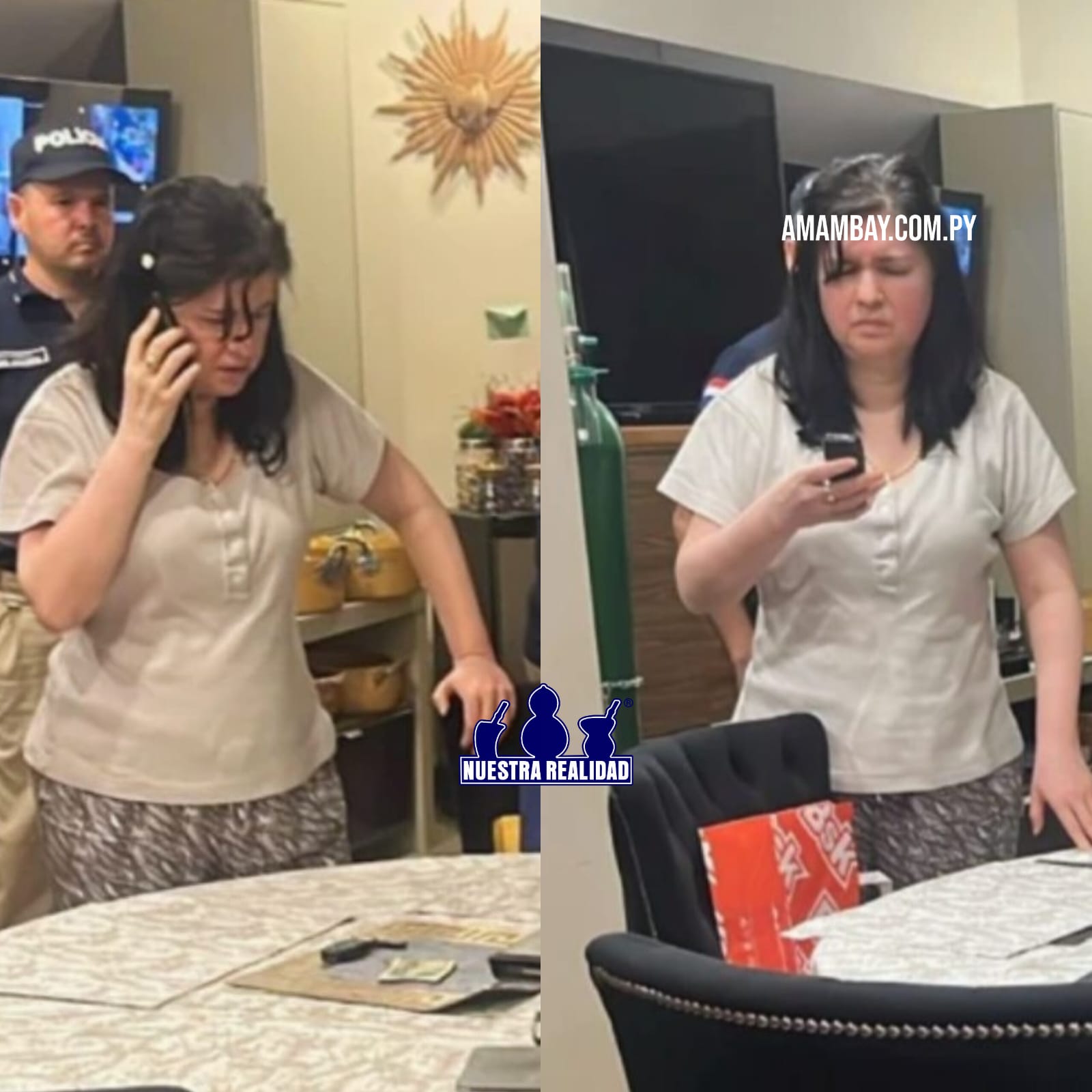 En las fotografías, la mujer aparece con un celular analógico en las manos, aparentemente conversando con una persona.