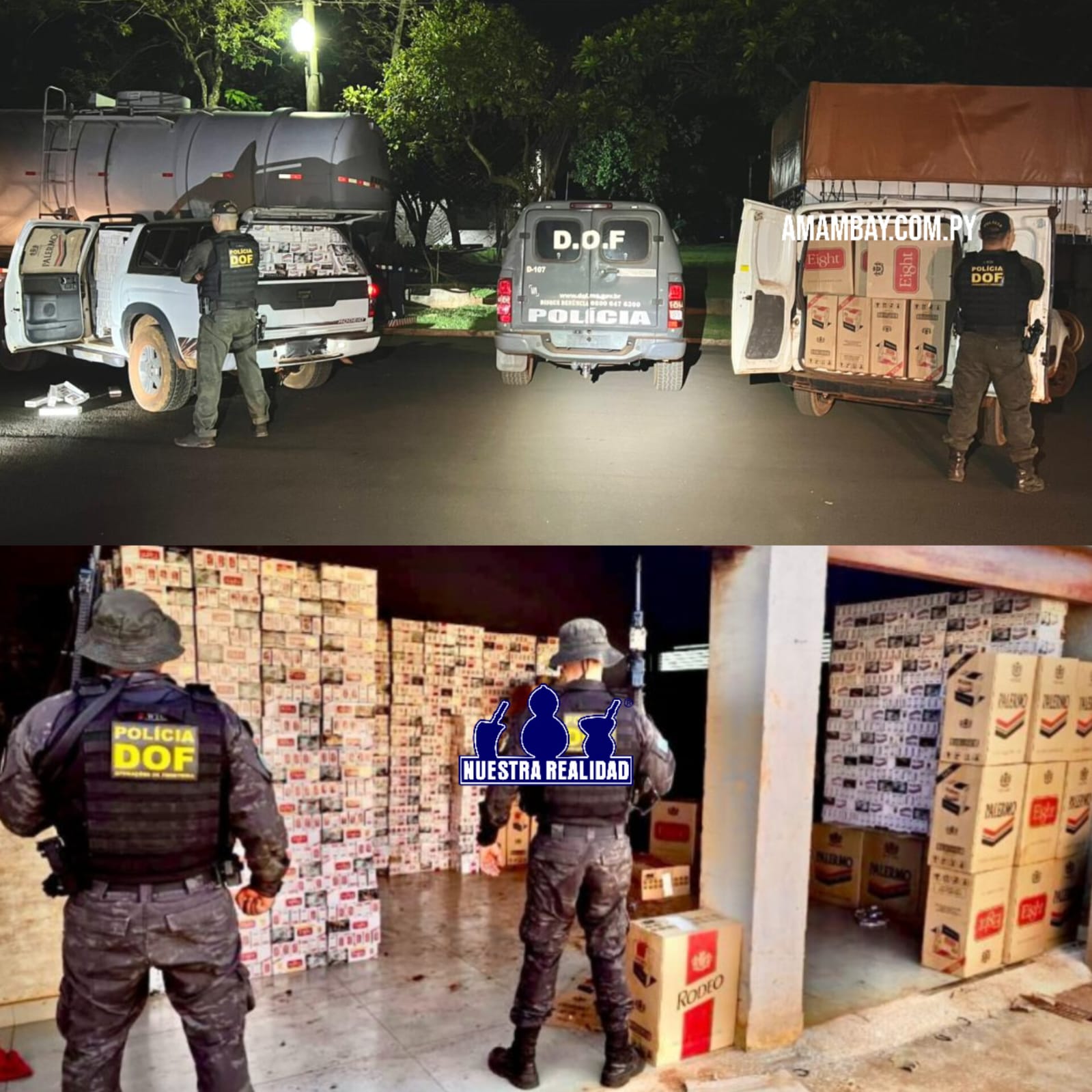Durante diligências, os policiais localizaram o imóvel e apreenderam 100 mil maços de cigarros em seu interior, além de outros 55 mil maços que seriam transportados em uma Fiat Fiorino e em uma caminhonete GM S10.