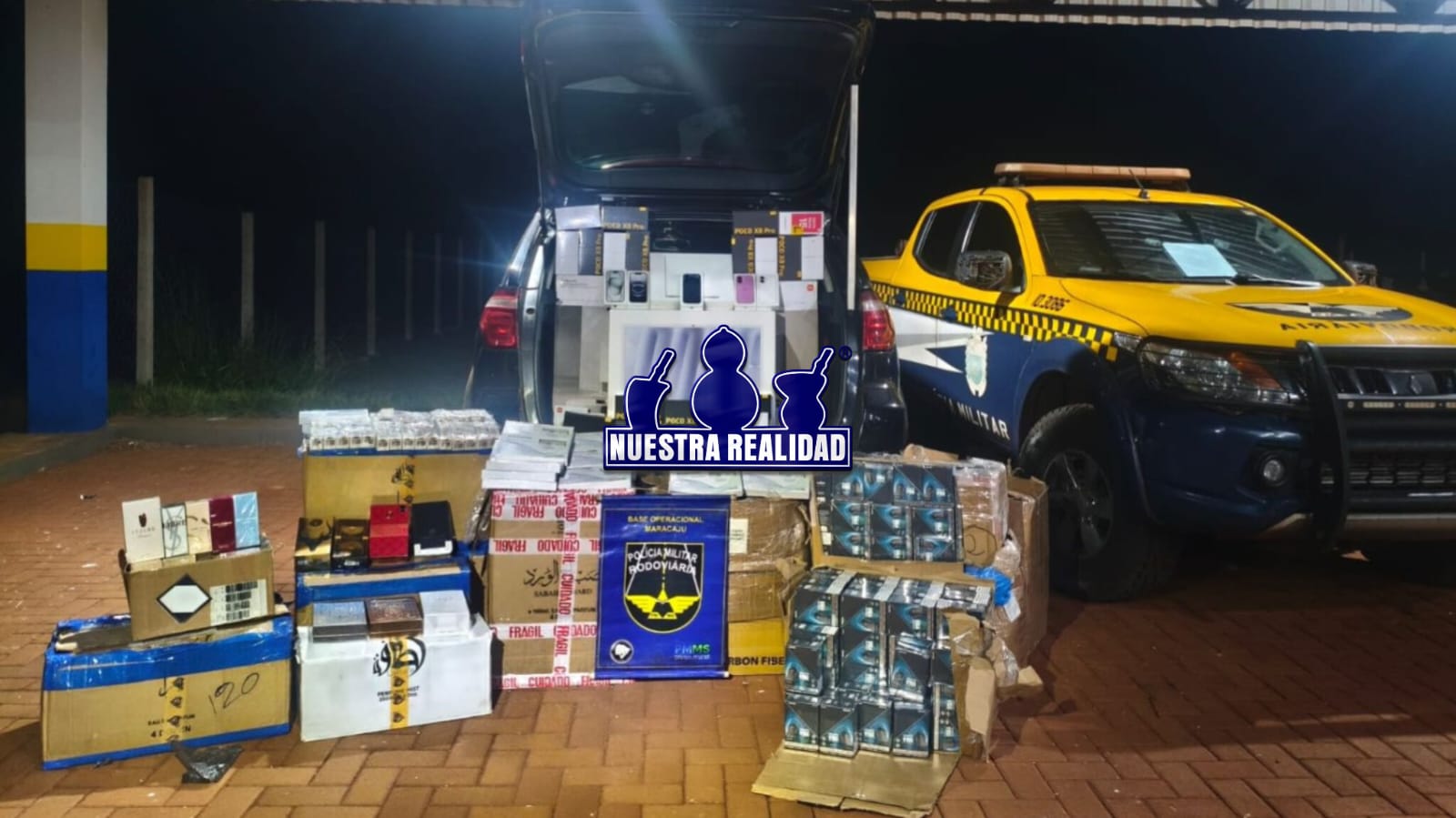 Durante vistoria no interior do automóvel, os policiais localizaram diversos produtos de origem estrangeira sem documentação fiscal, distribuídos no banco traseiro e no porta-malas.