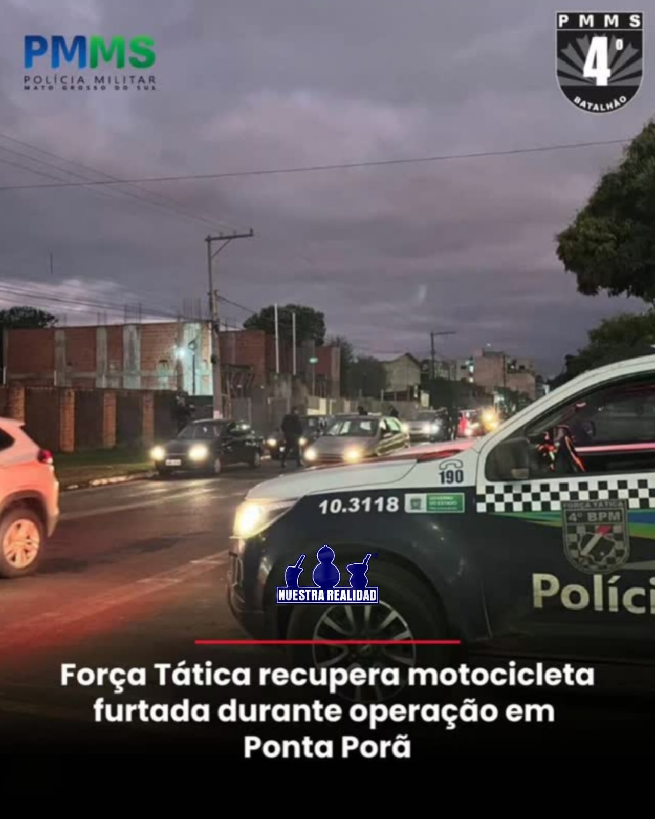 Ponta Porã (MS) – A equipe da Força Tática do 4º Batalhão de Polícia Militar recuperou, na noite de sábado (28), uma motocicleta furtada em Ponta Porã. A ação ocorreu no âmbito da Operação Força Total.