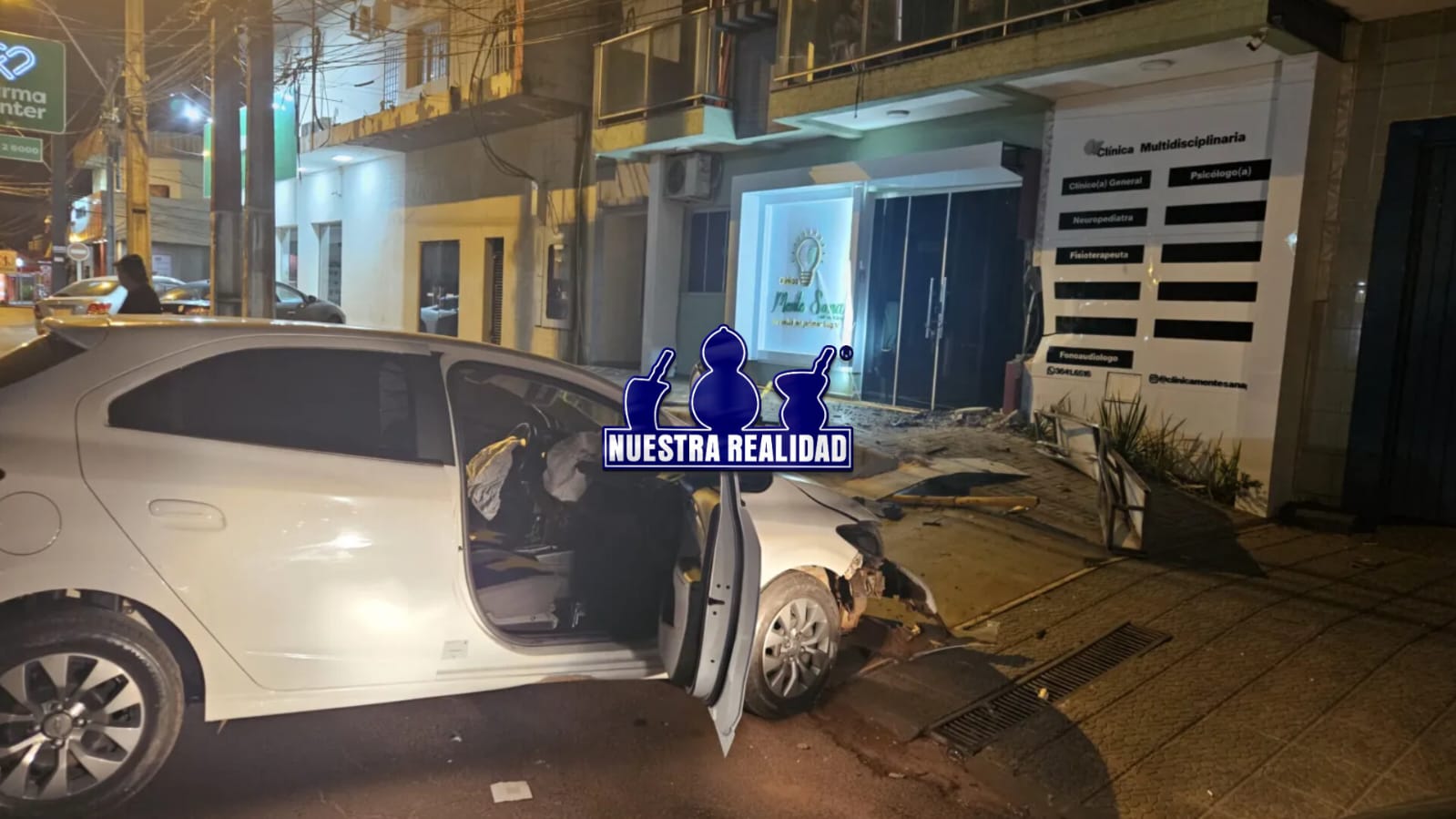 El hecho involucró a un automóvil Chevrolet Onix Joy, color blanco, con chapa AAGS 023, conducido por Agripino Gayoso Narváez, de 36 años, domiciliado en la Fracción San Luis. Según el reporte policial, al llegar al lugar los agentes encontraron el vehículo atravesado sobre la calzada, tras impactar contra la fachada de la clínica Monte Sana, ocasionando daños en la puerta blindex y parte de la estructura frontal.