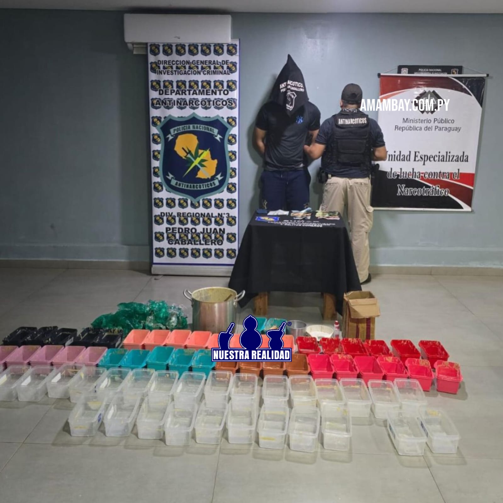Agentes del Departamento Especializado contra el Narcotráfico desarticularon un centro de procesamiento de drogas en Pedro Juan Caballero. El procedimiento, realizado en el barrio General Bernardino Caballero, derivó en la detención de un brasileño.