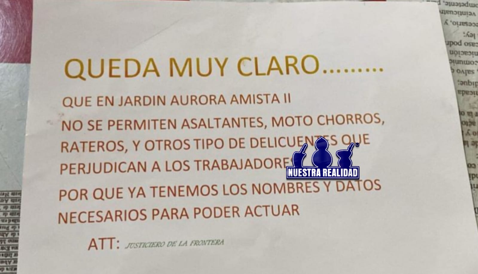 Según relató el subcomisario José María Ortiz para Urundey FM, la mujer encontró el escrito alrededor de las 6:00 de la mañana al abrir la puerta de su casa. El panfleto advertía en mayúsculas: “QUEDA MUY CLARO… QUE EN JARDÍN AURORA AMISTAD II NO SE PERMITEN ASALTANTES, MOTO CHORROS, RATEROS, Y OTROS TIPO DE DELINCUENTES QUE PERJUDICAN A LOS TRABAJADORES POR QUE YA TENEMOS LOS NOMBRE Y DATOS NECESARIOS PARA PODER ACTUAR ATTE: JUSTICIEROS DE LA FRONTERA”.
