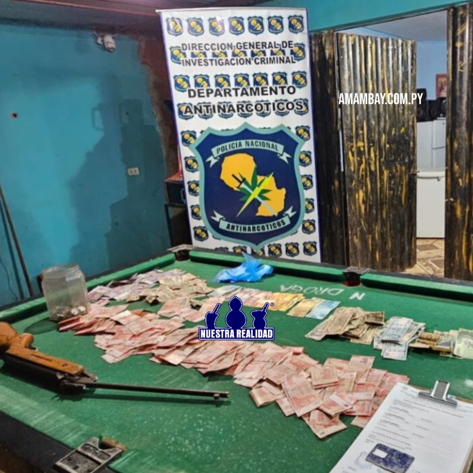Los agentes incautaron varias evidencias que vinculan el domicilio con la venta de estupefacientes como: una tarjeta con la descripción Tigo que contenía restos de una sustancia blanquecina, la cual arrojó resultado positivo a supuesta cocaína en el análisis primario de campo; dinero en efectivo que totalizó la suma total de 3.572.000 guaraníes en billetes de distintas denominaciones, producto presumible de la venta de las drogas en pequeñas porciones y un rifle de aire comprimido calibre 22.