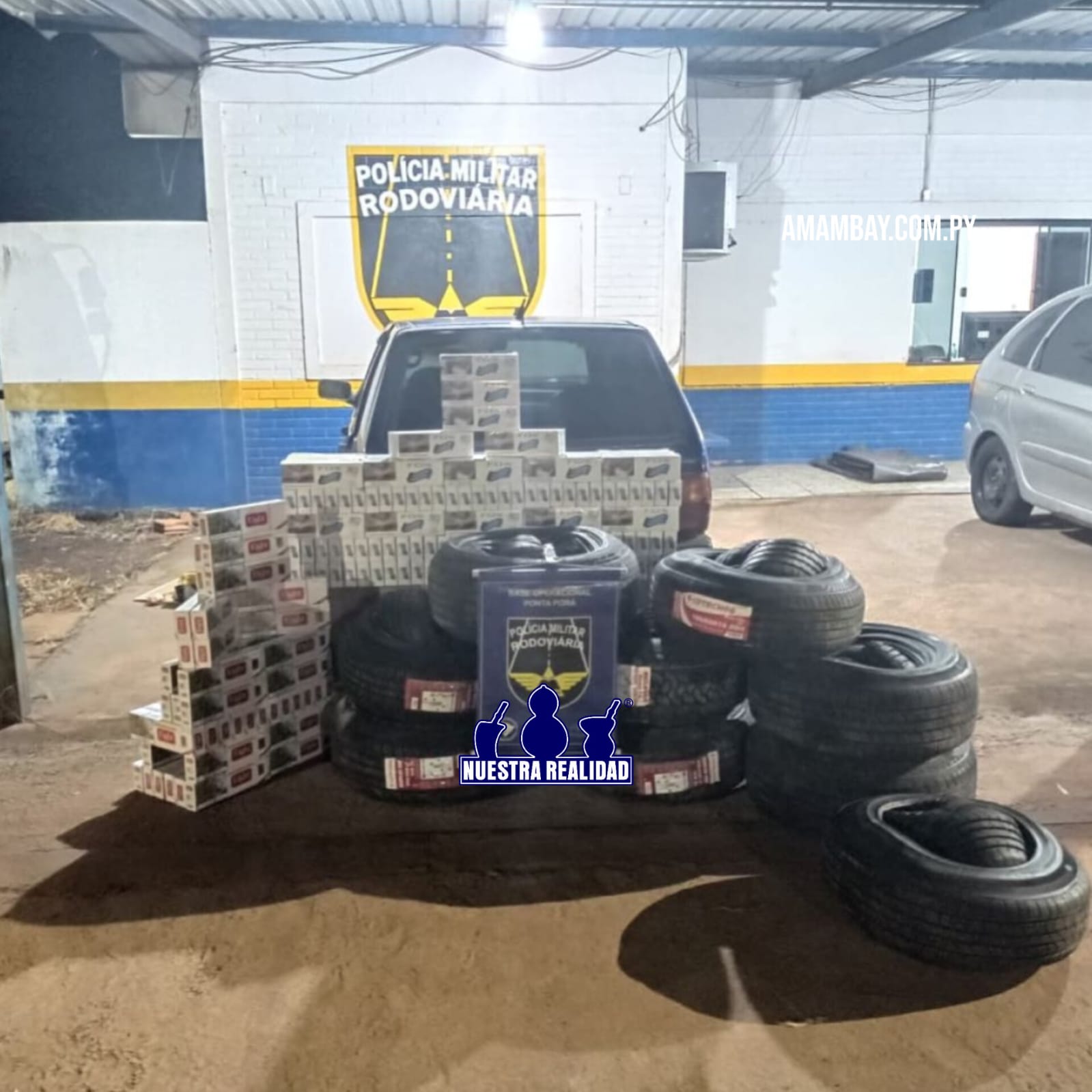 Na sexta-feira (20/2), a PMR (Polícia Militar Rodoviária) apreendeu na MS-164, em Ponta Porã, veículo Fiat Uno ocupado por dois homens e carregado com cigarros e pneus contrabandeados do Paraguai.