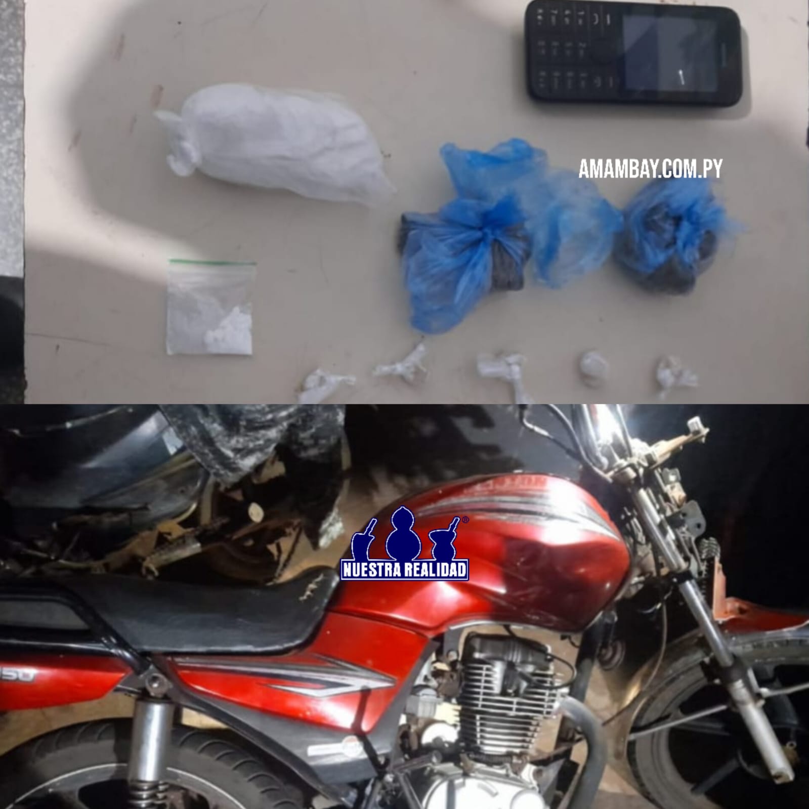Durante a vistoria, os policiais encontraram uma motocicleta Kenton 150cc de cor vermelha, com registro de furto/roubo. No interior da casa, foram encontradas e apreendidas 21 porções de crack, cerca de 32 gramas de cocaína e aproximadamente 35 gramas de maconha, todas embaladas e prontas para comercialização.